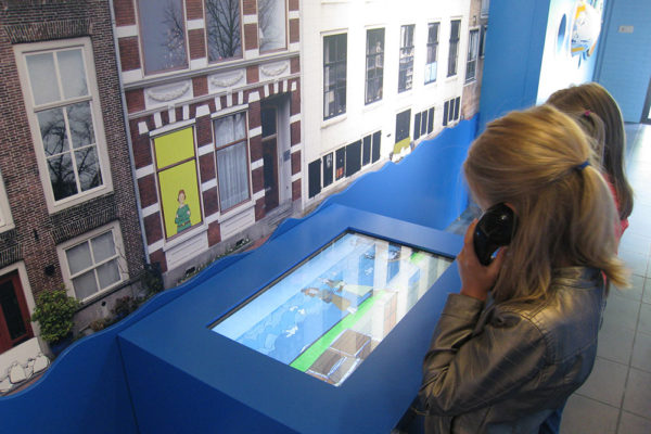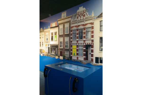 Animatie over water bij de Drechtsteden in het verleden en het heden op videomonitor met drukknop en twee luisterhoornen.