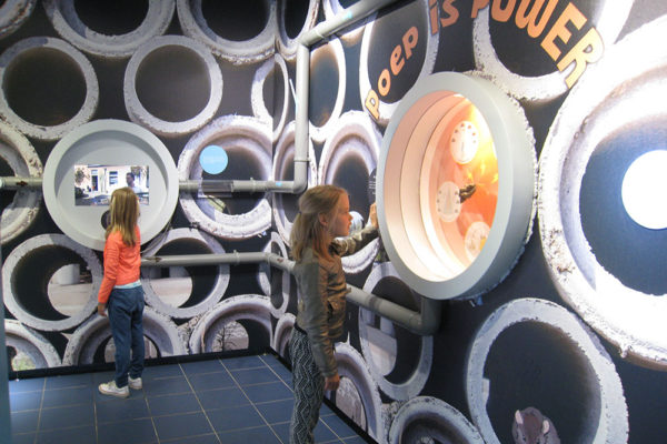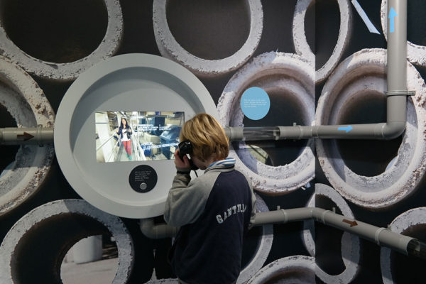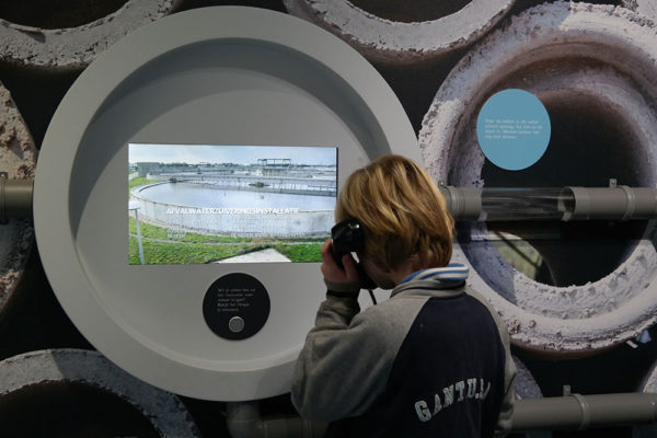 De bezoeker drukt op de knop en ziet hoe het rioolwater gezuiverd wordt.