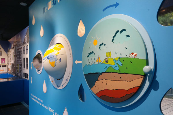 Middels een draaischijf laat de bezoeker het water van de kringloop draaien. Druppels rondom de draaischijf lichten op en geven extra informatie.