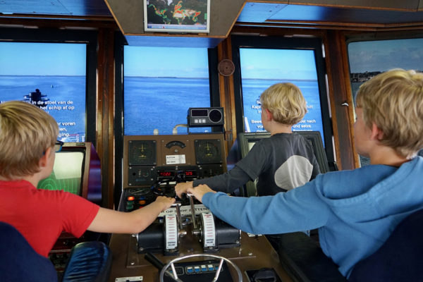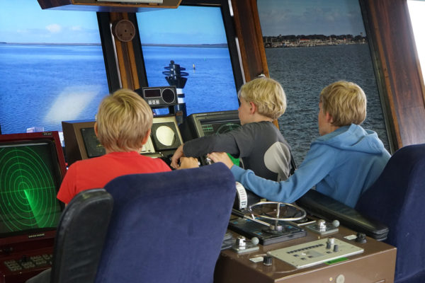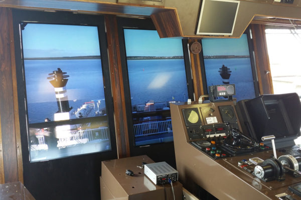 In de scheepsbrug hebben we drie 55-inch videomonitoren gemonteerd. Alle monitoren vertonen gezamenlijk één film. De bezoeker start de film als hij de gashendel overhaalt. Zo ervaart de bezoeker hoe het is als kapitein op zo’n veerboot.