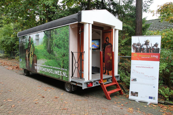 Schrik niet, maar zo’n 1600 jaar nadat de Romeinen de lage landen verlieten zijn ze terug! Dit keer wordt er geen land veroverd maar is er een wereld van informatie te winnen. Het mobiele informatiecentrum MobiLimes zet de Romeinse invloeden in dit deel van de wereld letterlijk en figuurlijk op de kaart. Limes (uitgesproken als lie-mes) is Latijn voor ‘grens’ en ‘pad’. In Nederland liep de grens van het oude Romeinse rijk van ca. 57 voor tot 400 na Christus van Katwijk via de oude Rijn langs Arnhem naar Duitsland. De tentoonstelling laat aan een breed publiek zien wat de Romeinen ons gebracht hebben en wat er zich rond de ‘Limes’ heeft afgespeeld. En moderne, interactieve technieken laten zien dat de invloeden van toen vandaag nog voelbaar zijn.