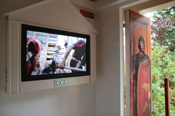 In de nieuwe, op maat gebouwde, verrijdbare schaftwagen verzorgde Moetwil en van Dijk de minibioscoop. Op een 32-inch videomonitor gekoppeld aan een solidstate HD speler en een drukknoppaneel kun je onder meer een film over de Bataven selecteren. Bezoekers nemen plaats op drie stoelen in de vorm van zuiltjes en horen het filmgeluid via vandaalbestendige hoofdtelefoons uit het plafond. Zo stoort het geluid andere bezoekers niet.