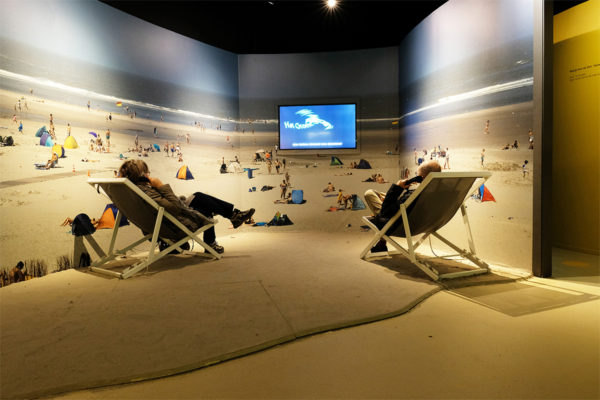 Bij binnenkomst waant de bezoeker zich op het strand middels een hele grote panoramafoto van het strand en de zee. Middenin die grote foto is een breedbeeld videomonitor ingebouwd. Al luisterend in de strandstoel is de film met animatie over het ontstaan van Ameland en het behoud van het strand te zien én te horen via luisterhoorns.
